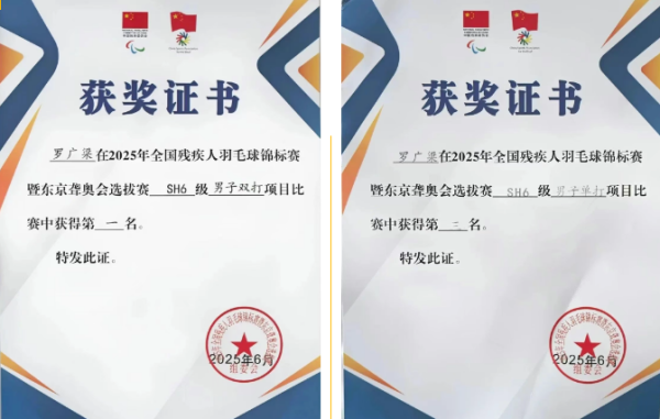 2025年6月全国残疾人羽毛球锦标赛暨东京聋奥会选拔赛(湖北武汉)单打第3名 双打第一名