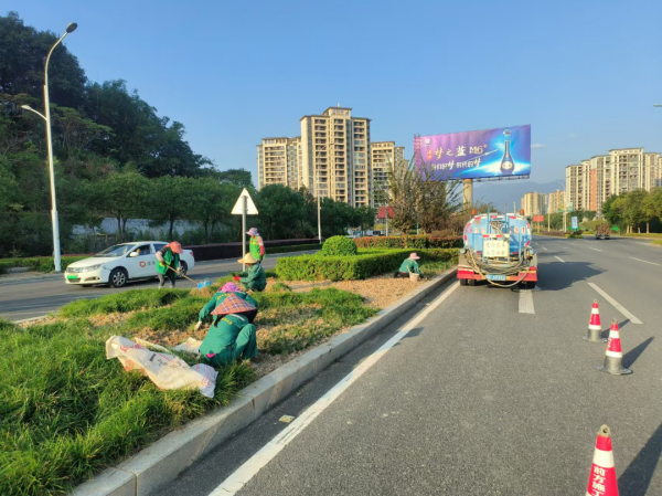 开展景观提升工程:建立“补植—养护—巡查”全周期管养机制,累计补植苗木约8500平方米,修复树池石210处,安装及修复加固绿化带护栏300处,城区绿化完好率达98%。