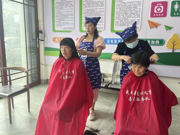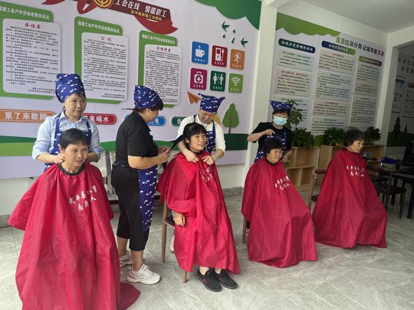 5月21日,武平县教育路工会驿站洋溢着温馨的氛围,“武平阿嫂”志愿者正专注地为老人们理发。她们一边耐心询问老人的需求,一边娴熟地修剪发型。